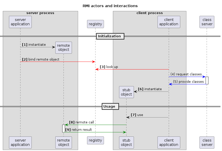 Zunächst muss der Serverprozess einmal Objekte zur Verfügung stellen, mit denen andere Prozesse interagieren sollen [1]. Diese Objekte müssen dann bei einer Registry publiziert werden [2]. So können Clientprozesse diese auffinden [3] und internen einen Stub erzeugen [6], mit dem der Client-Prozess redet [7] und der transparent die Kommunikation mit dem Server-Objekt übernimmt [8] und [9]. Zur Erstellung des Stubs ist es eventuell nötig, den Code für Klassen nachzuladen, der in der Clientanwendung nicht zur Verfügung steht (4) und (5). Daher gibt es bei RMI die Möglichkeit, einen Class-Server bereitzustellen, von dem die fehlenden Klassen nachgeladen werden können.